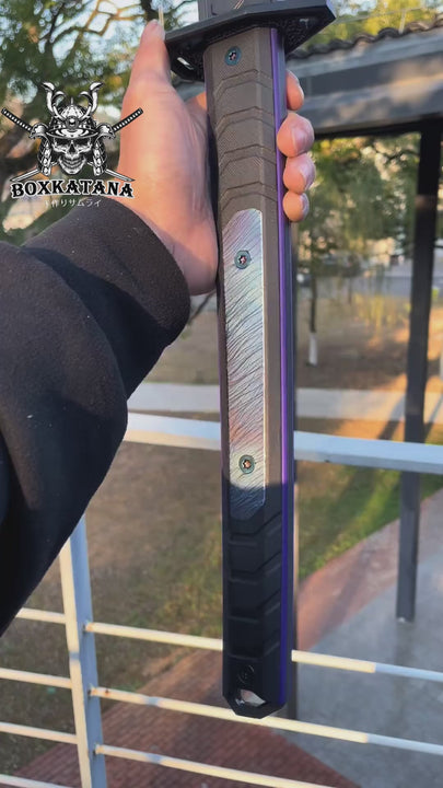 Hand-engraved TC4 titanium hilt inlays/spacers/guard create light-diffracting patterns while enhancing grip